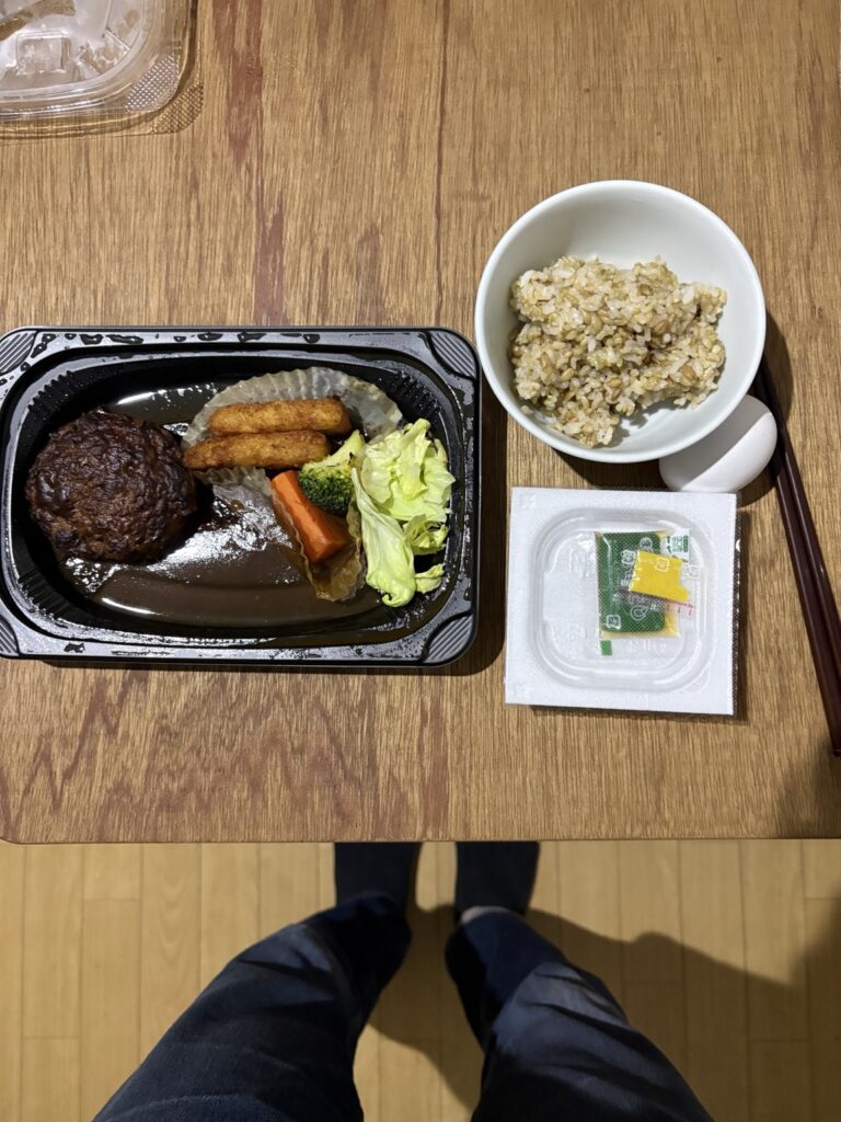 ハンバーグにご飯、納豆、卵。そこにレタスまで加わると、急にいつもの自分の食卓に寄ってくるのが不思議です。